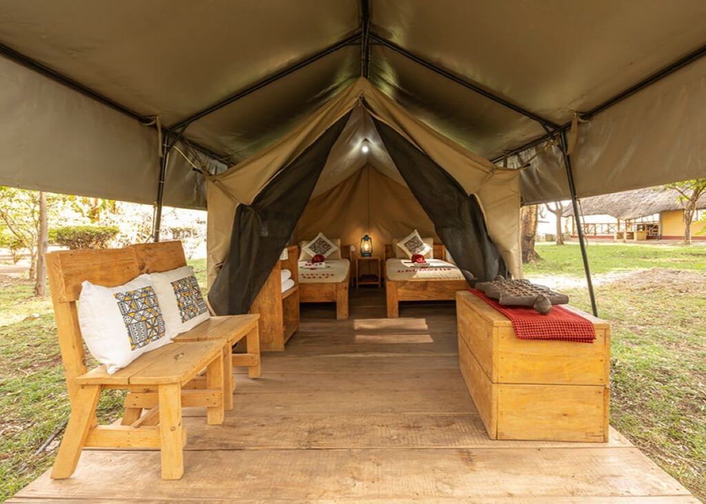 For those yearning for a more rustic experience, the Safari Tents provide an idyllic retreat nestled within nature’s embrace. Inside, guests will find two single beds, while outside, a small seating area beckons for relaxation amid the serene surroundings.