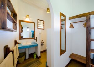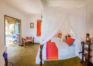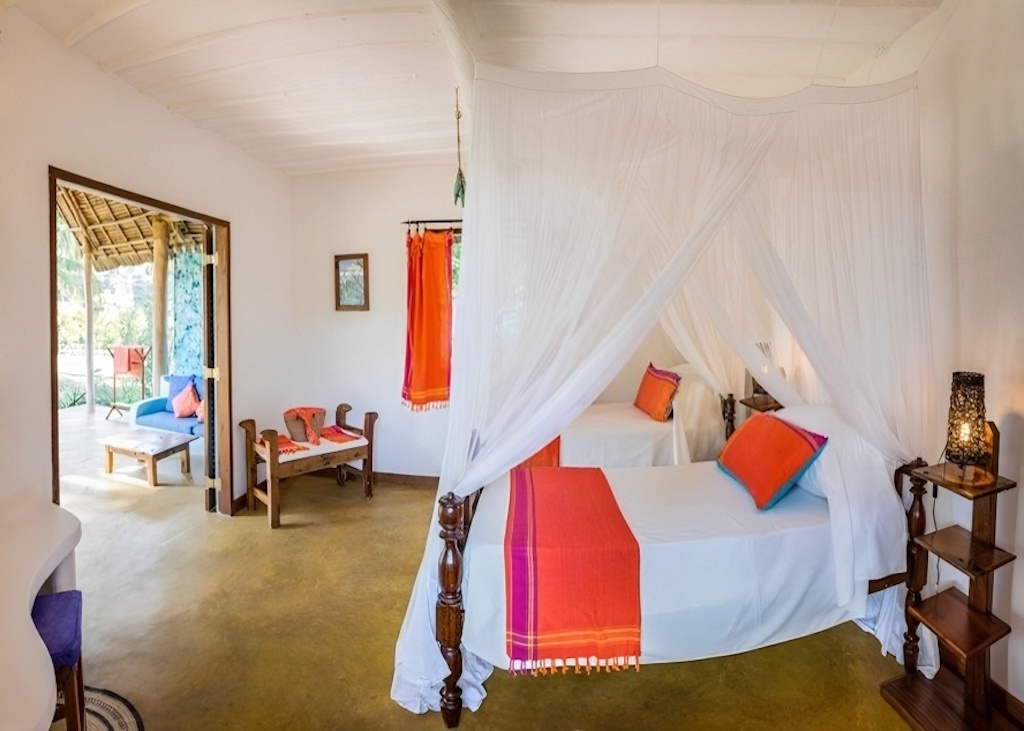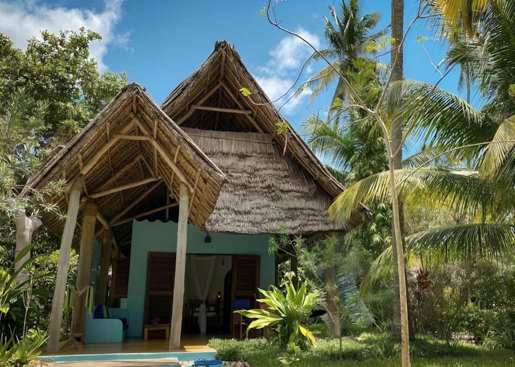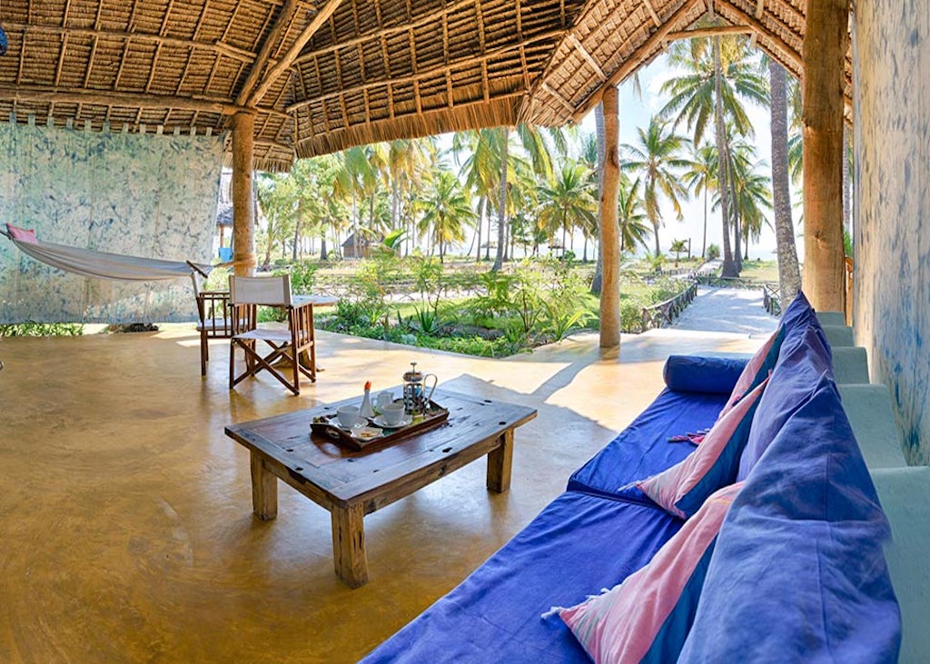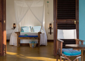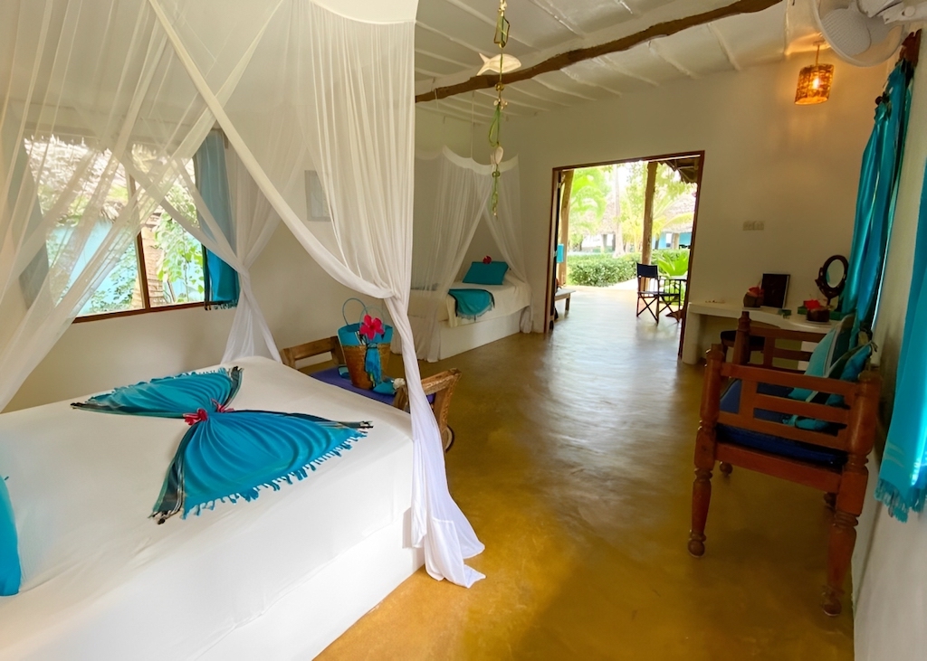 The property features 15 bungalows, including family units, triples, twins, and doubles, all facing northwest toward mainland Tanzania. Each room comes with a spacious veranda equipped with comfortable seating and hammocks. The interiors showcase furniture crafted from old wood, featuring a blue and white color scheme inspired by whale sharks. Modern amenities include safes, constant power supply, and en-suite bathrooms.