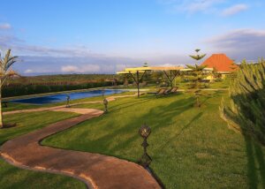 Outside, the lush gardens and green lawns surround a serene pool, where colorful birds and small wildlife roam freely.