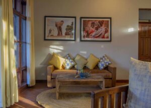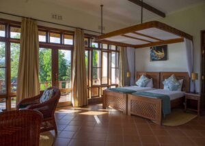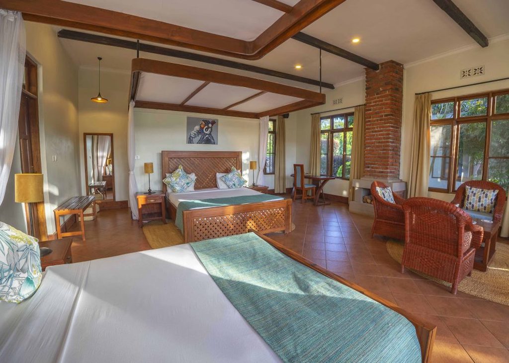 The lodge features 26 cottages, including three spacious family suites. Each cottage is built for comfort and charm, with handmade furniture, a warm fireplace, and a large private veranda. The interiors include two large beds—one king and one queen—set beneath flowing mosquito netting, making each room ideal for twin or double occupancy.