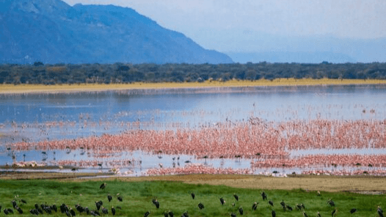 During the wet seasons (November–December and March–May), the lake can expand to cover up to 60% of the park’s total area—an impressive 231 km². During these months, its high-alkaline waters attract a variety of migratory waterbirds, including the iconic pink flamingos.