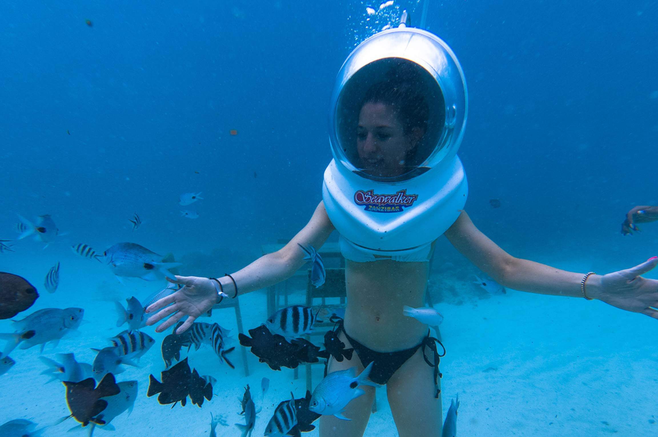 After boarding the boat, you’ll cruise out across Zanzibar’s calm blue waters toward the sea walk platform. Your tour begins with a briefing, where your guide introduces the equipment and explains how the underwater helmet works. You will also learn hand gestures in case you might get uncomfortable or would like to go back up to the surface.