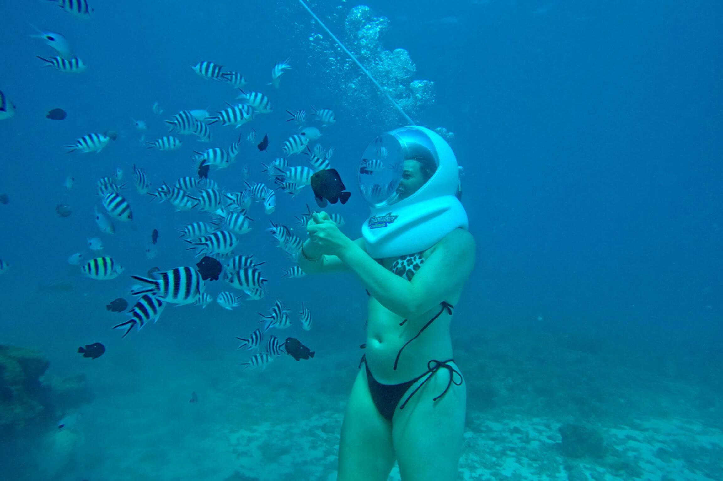 Your guide will help you put on the helmet and descend gently down the ladder to the seabed. The feeling is unlike anything else! Walk across white sand while colorful reef fish swim around you, all with crystal-clear visibility. You’ll be able to see corals, marine plants, and schools of tropical fish at eye level, making this a perfect experience even for non-swimmers.